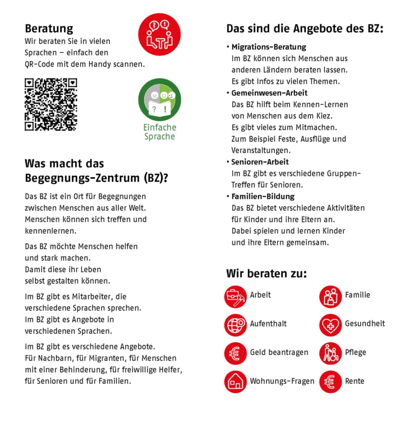 Hier finden Sie Informationen zu dem Begegnungs-Zentrum (BZ) der AWO. Das BZ ist ein Ort für Begegnungen zwischen Menschen aus aller Welt. Im BZ gibt es Mitarbeiter, die verschiedene Sprachen sprechen. Im BZ gibt es Angebote in verschiedenen Sprachen.